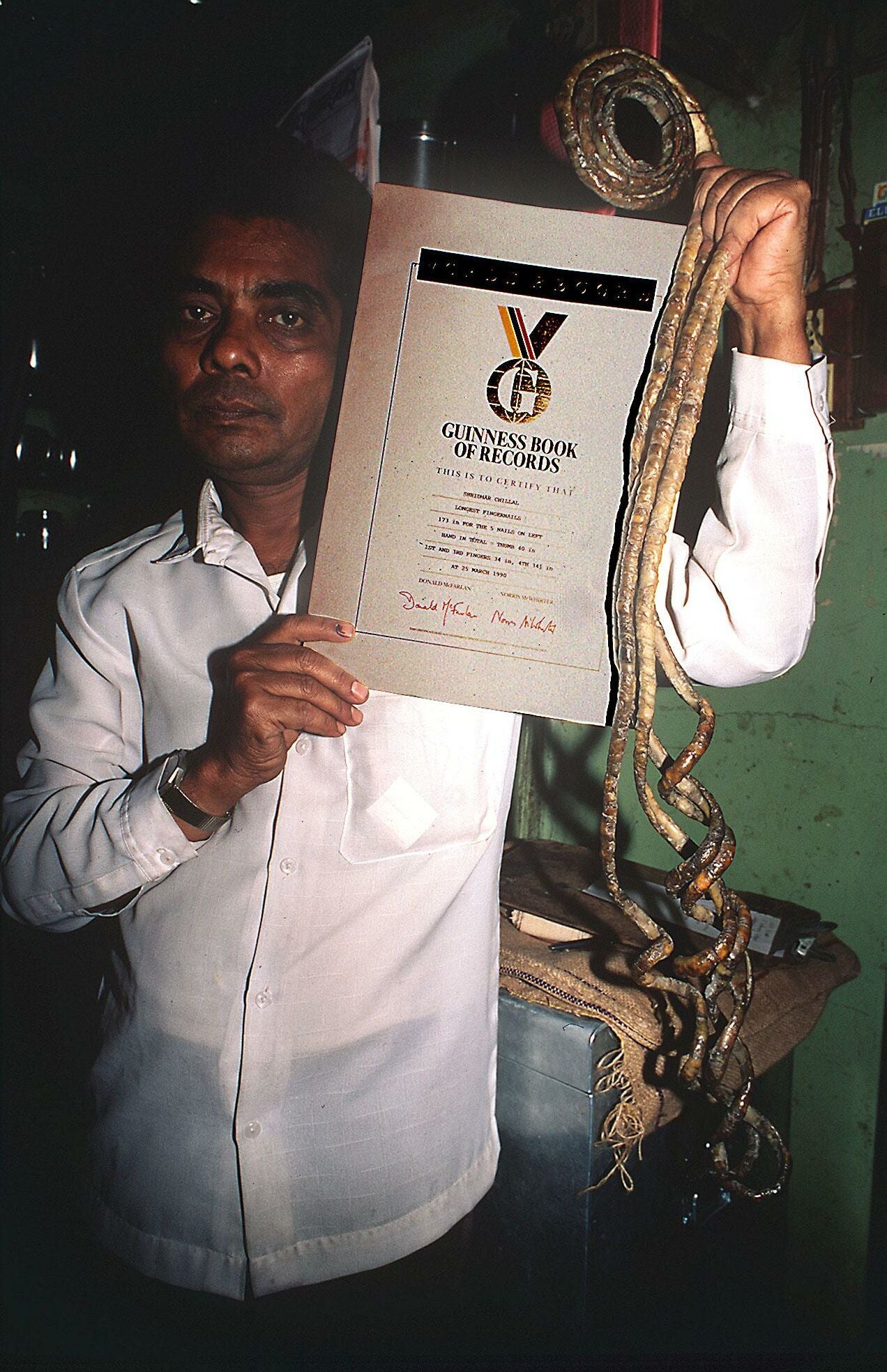 Most of his other records involve either balancing something on a body part, or doing anything at all while pogo-sticking. I've come to realize that if you have steady hand and know how to pogo stick, you can really make your presence felt in the Guinness Book of Records. I don't know why the world's premier world record keeper had to devolve into this nonsense. It's very stupid, and it waters down the accomplishments of people who set records that actually matter. Like the Indian guy with long fingernails.