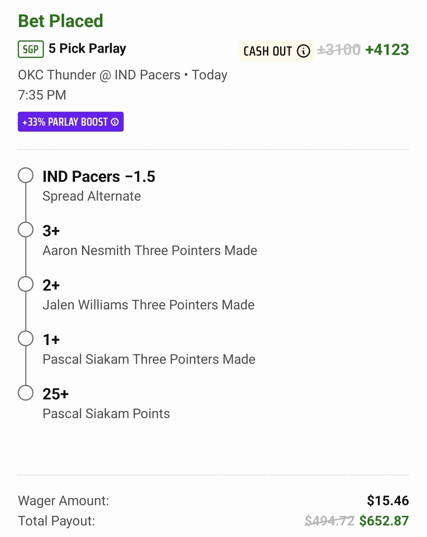 Then again. Who knows? Everyone has the Pacers dead to water. But if there's one thing we know about this team it's that anything can happen. Haliburton is hurt, so we'll definitely need Siakam to take on the load if they can force a Game 7. And that should leave Nesmith open for a some three balls. I can't see him making less than three if Indiana finds a way to pull this off.