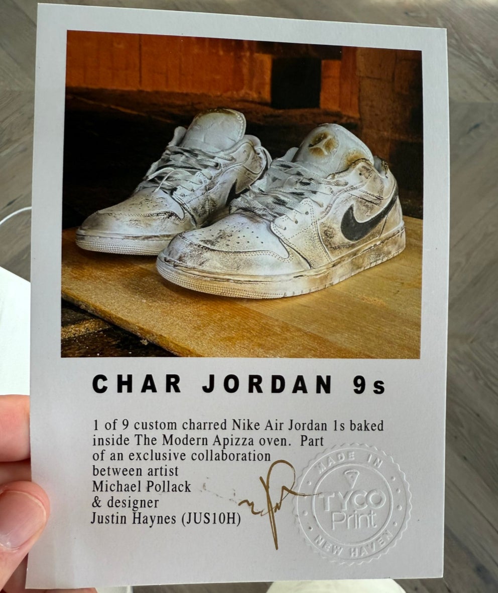 "1 of 9 custom charred Nike Air Jordan 1s baked INSIDE The Modern Apizza oven. Part of an exclusive collaboration between artist Michael Pollack & designer Justin Haynes (JUS10H)"