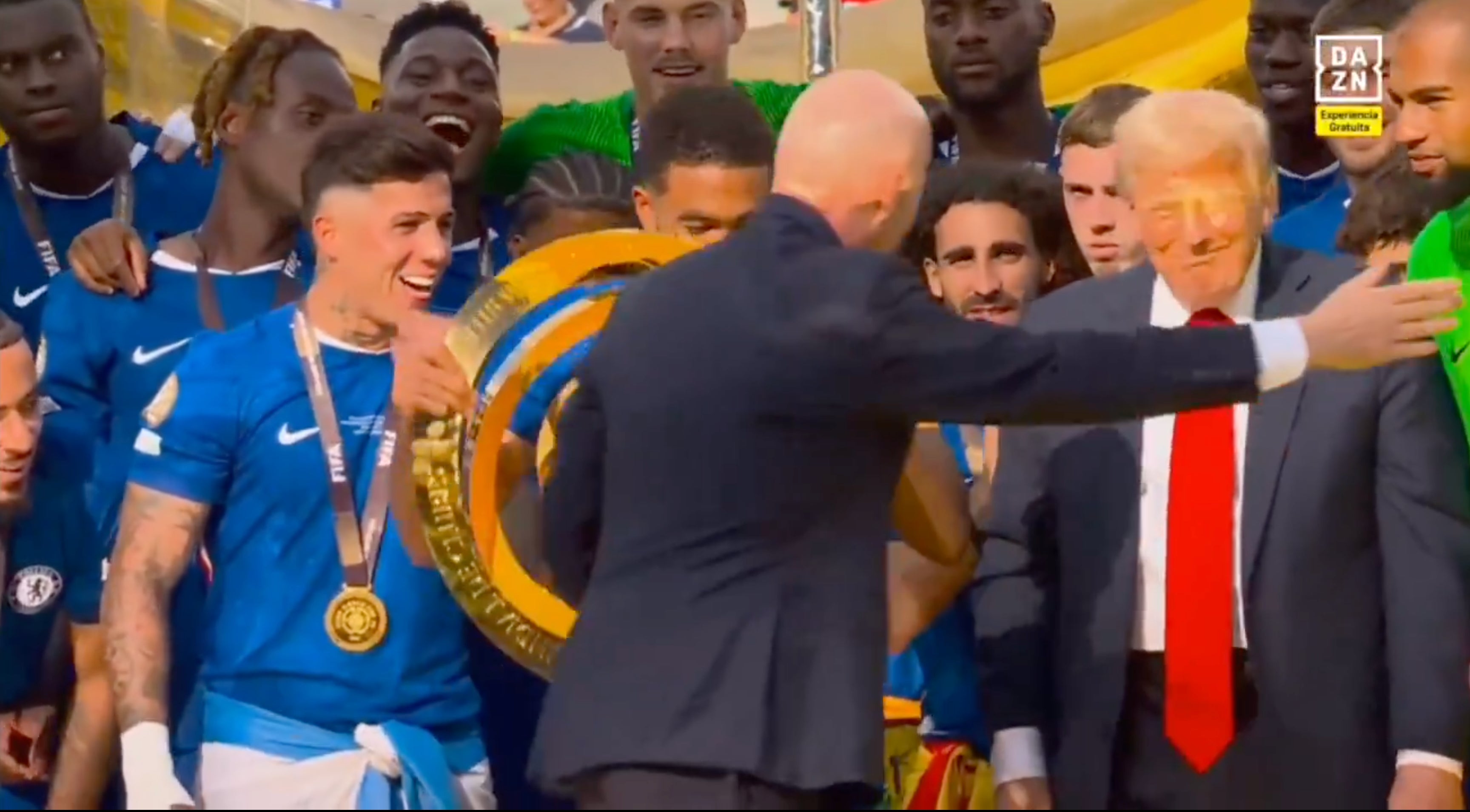 After the awards presentation, Chelsea players gathered to accept the trophy and celebrate as a team. Trump stood with the Chelsea players as they waited to raise the trophy. Infantino eventually pulled Trump behind the players so the team could celebrate.