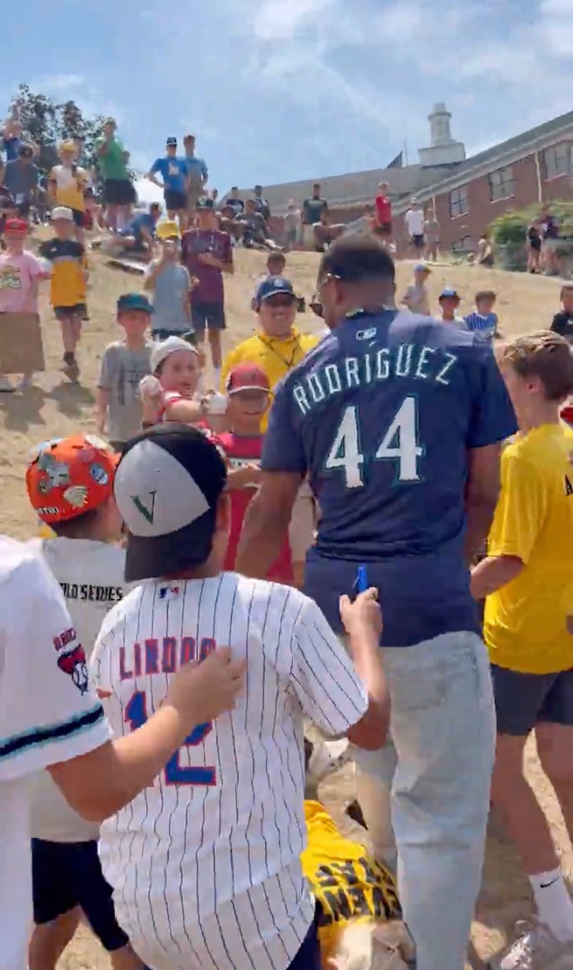 We've got the Little League Classic in Williamsport tonight with Seattle and the Mets, but before the games kick off the players get to hang out with the kids and athletes in the tournament. It's a really cool scene, especially for the kids there. Butttttt something tells me that Mariners fans just saw their season flash before their eyes, you could hear the groans and moans from the PNW after this video came out. Seattle superstar Julio Rodriguez sliding down the famous hill on a cardboard box as is tradition, until a security guard came tumbling down the hill and barreling into Julio's knees. Vontaze Burfict would be proud of the way she attacked the knees, we'll say that.