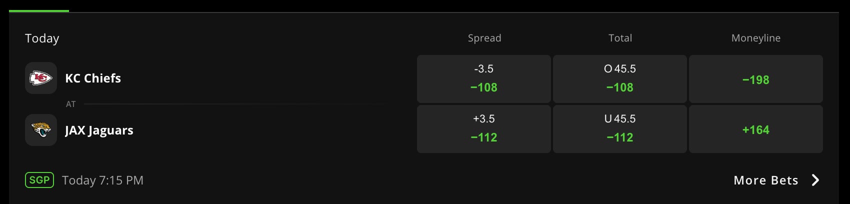 Monday Night Football is tonight- The 2-2 Kansas City Chiefs at The 3-1 Jacksonville Jaguars +3.5 (45.5), 8:15 PM ET