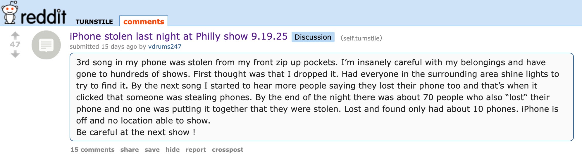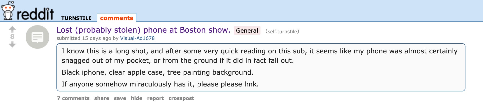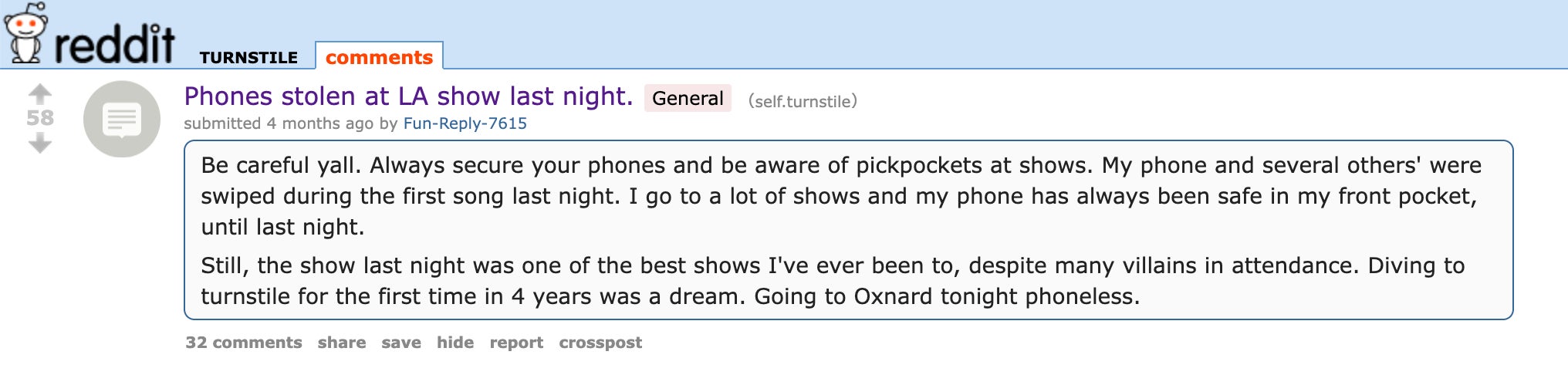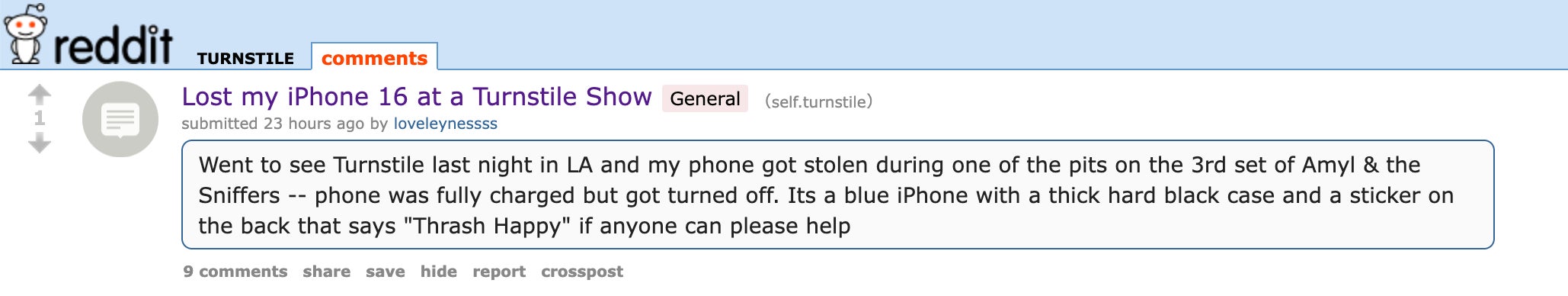 A few months ago, I started noticing a lot of "Lost/Stolen Phone" posts on some of my favorite bands' subreddits. It was mainly on the page for Turnstile, a hardcore band with crowds that typically look like this….