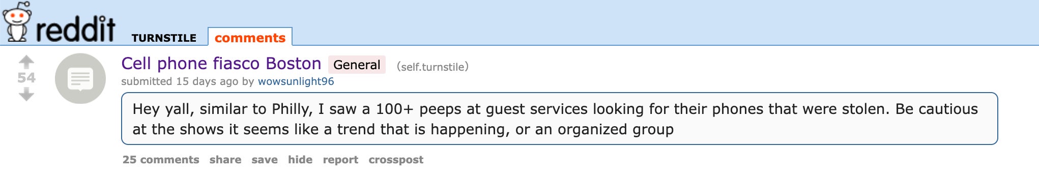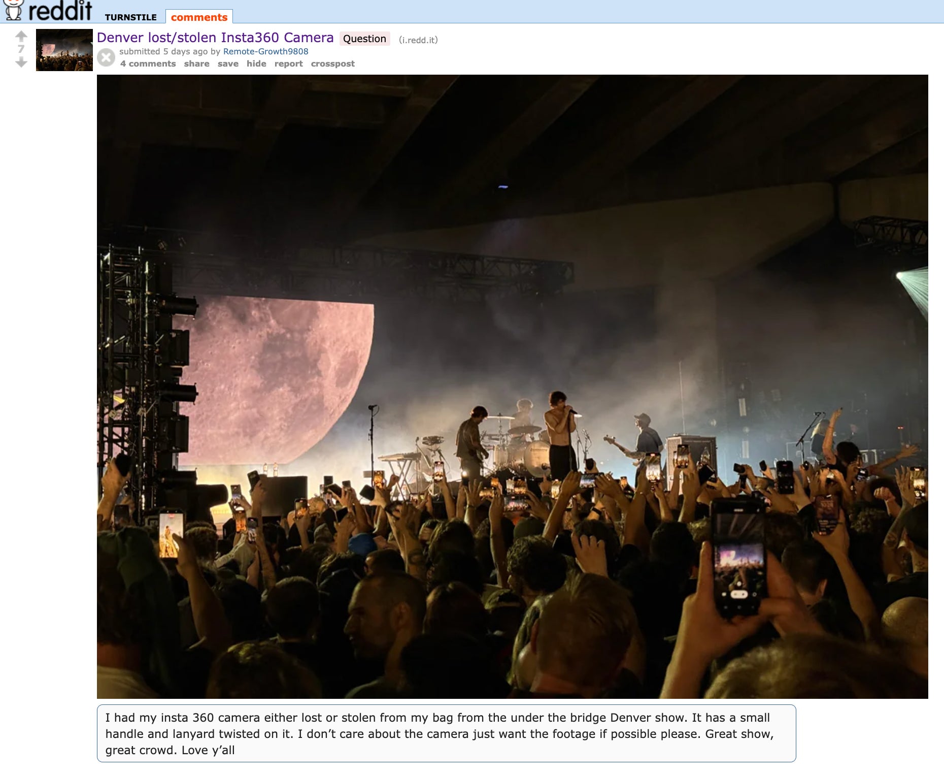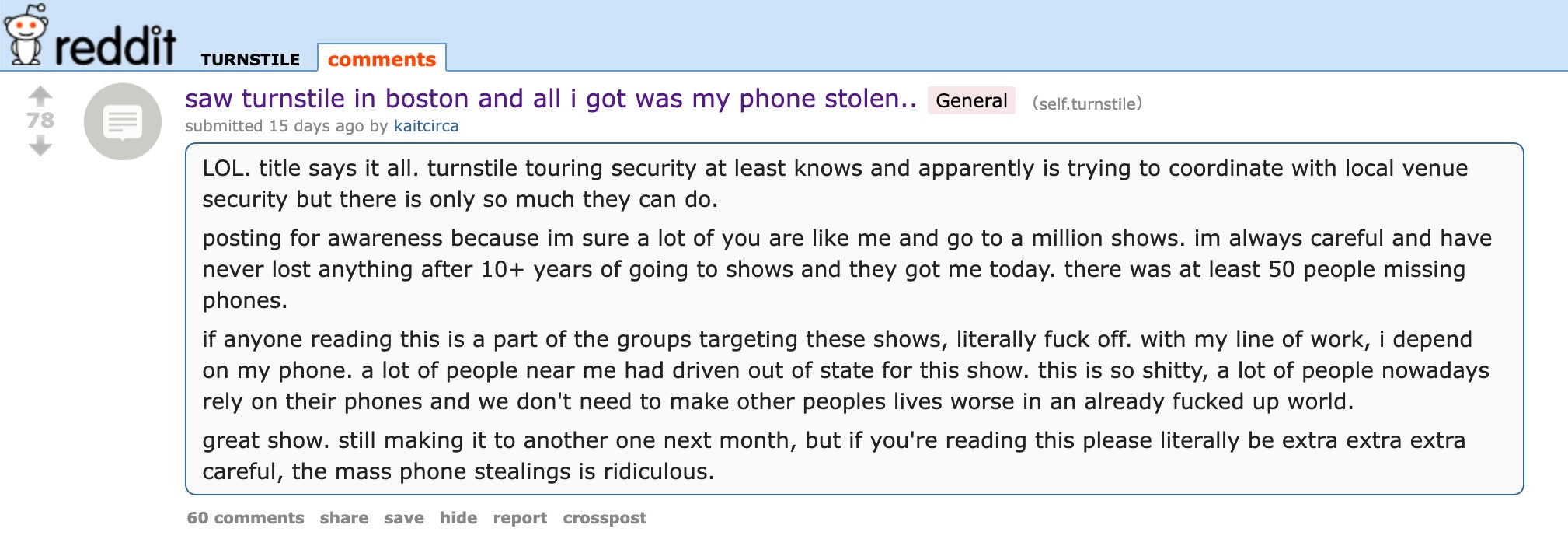 A few months ago, I started noticing a lot of "Lost/Stolen Phone" posts on some of my favorite bands' subreddits. It was mainly on the page for Turnstile, a hardcore band with crowds that typically look like this….