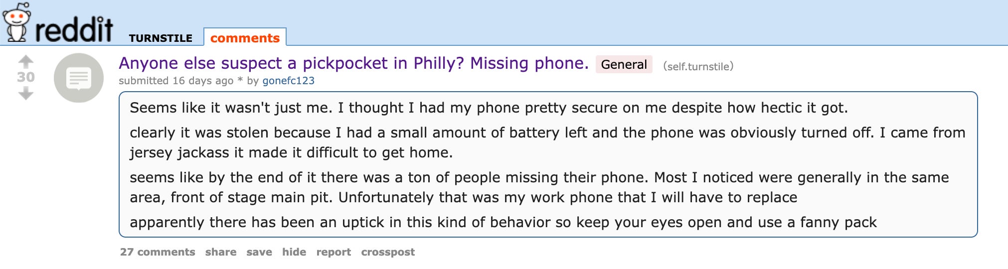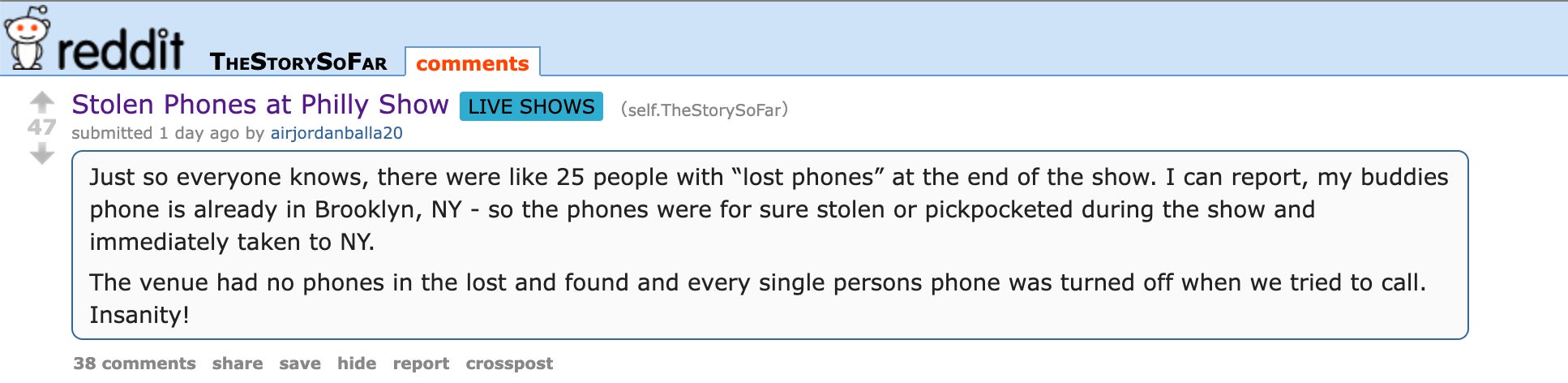 And I even saw a post on the subreddit for The Story So Far yesterday, claiming at least 25 phones were stolen at their Philly show this week….