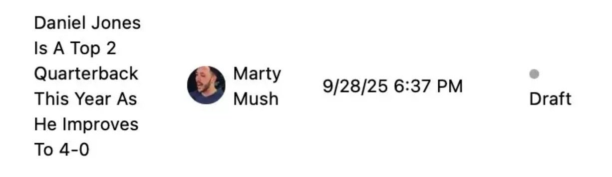 Thank you for being the QB the Colts needed, Daniel Jones. I didn't believe in you from the start. I'm still not quite sure I'm believing what I'm seeing. But Indiana Jones is 3rd in the NFL in passing yards and has the Indianapolis Colts 4-1. Giants fan Marty Mush posted this blog today.