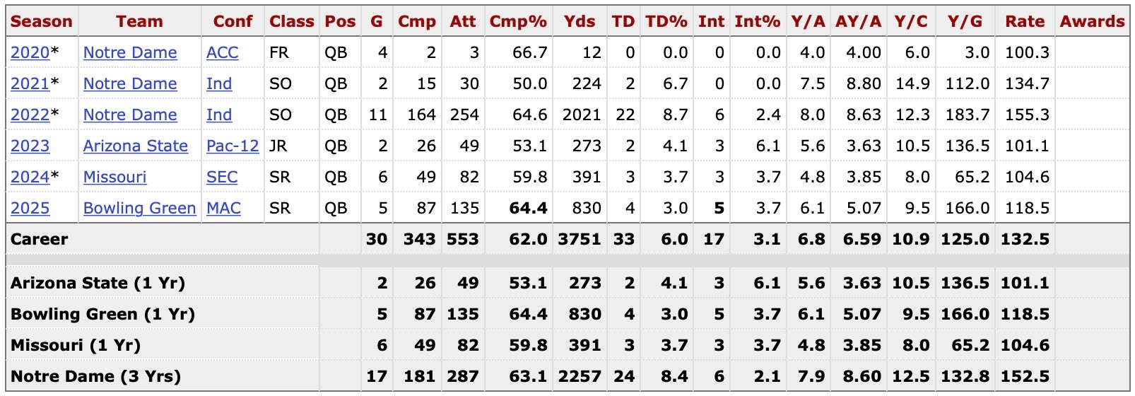 Bowling Green's team this year isn't especially great, but they're a serviceable MAC team. They've got some "dudes". We just don't really have anybody who can get them the ball. You might be familiar with resume of one Drew Pyne.