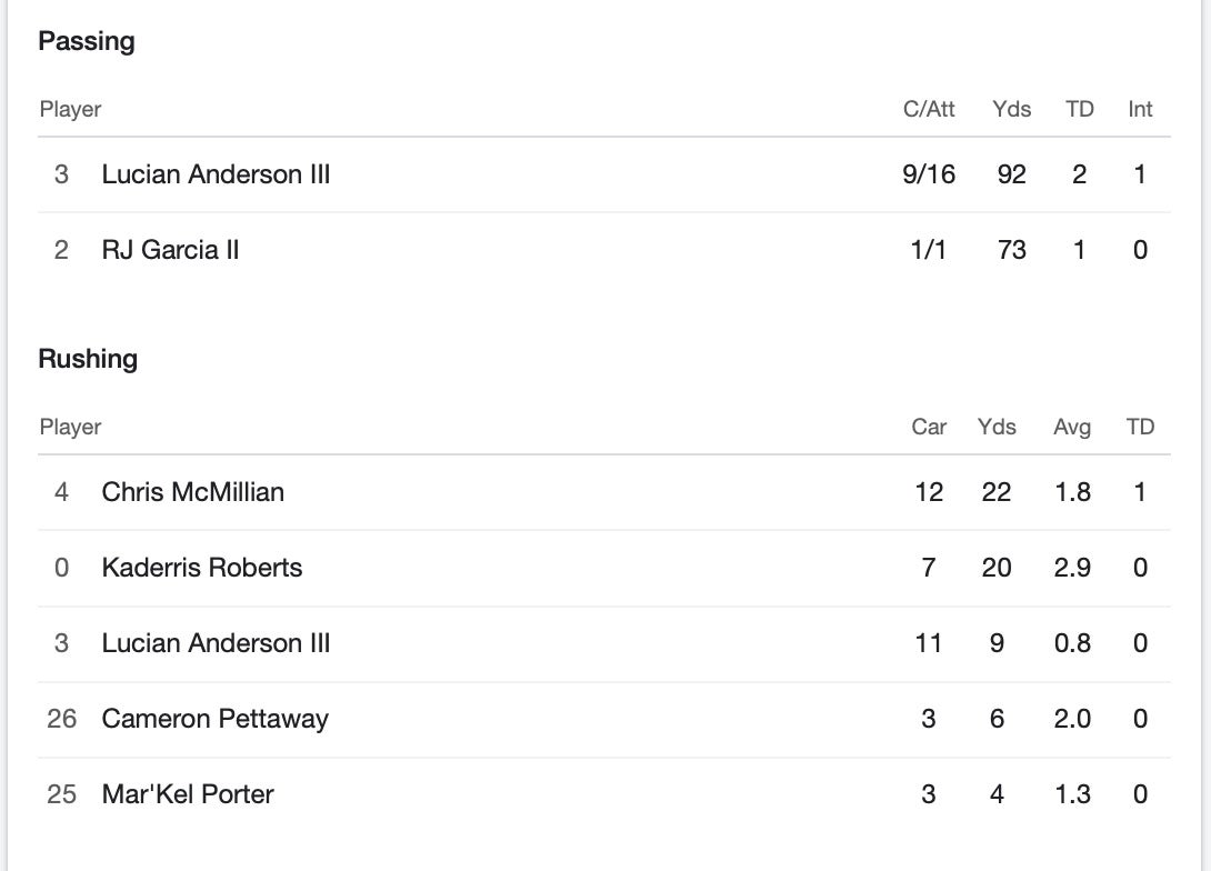 He's our starting quarterback this year. He's… a quarterback. But he's hurt right now. And unfortunately our backup QB doesn't have working arms. He's got a decent set of legs. But he's not out there slinging the rock around the field. To be frank, for the first half of the game, Bowling Green made getting a first down look like climbing Mount Everest. For reference, here was our QB's final stat line. This is not the amount of yards a team should have at the end of a game in which they score 28 points.