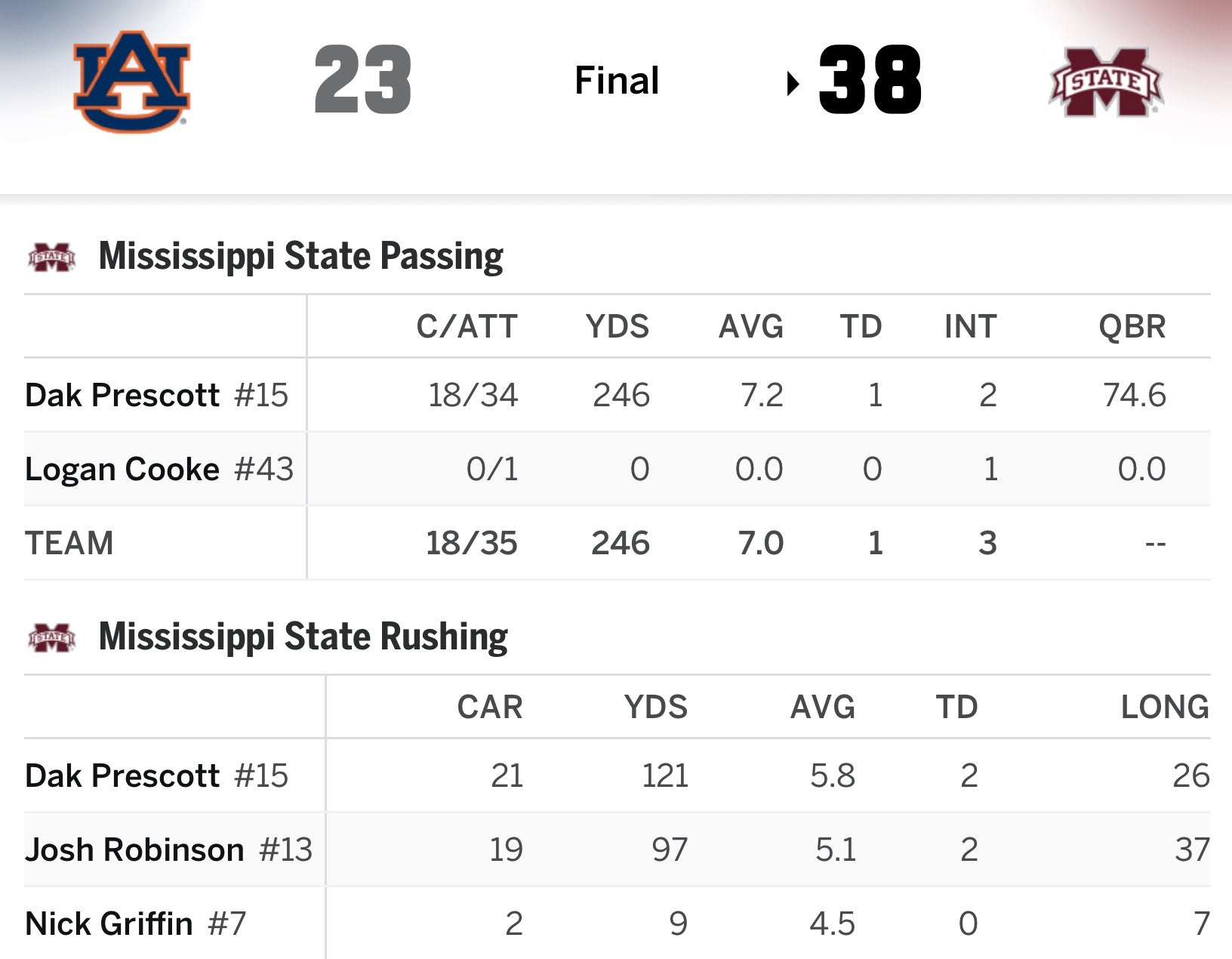 Mississippi State went from unranked to #1 in three weeks after rattling off consecutive wins vs #8 LSU, #6 Texas A&M, and #2 Auburn. Upon watching back those highlights, I was borderline shocked at how great of a runner Dak Prescott was back then. I forgot just how much of the entire Mississippi State offense he was responsible for. In the Auburn game, he threw the ball 34 times, and led the team with 21 carries. For a stretch of time there, he was basically Cam Newton 2.0.