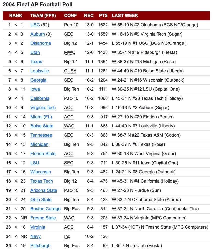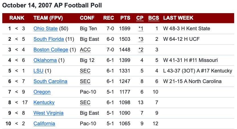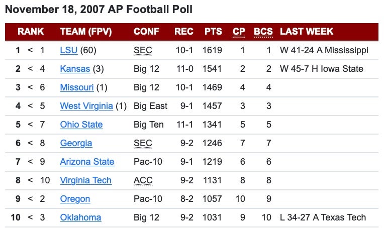 Naturally, Missouri instantly lost their next game (Big 12 Championship) to Oklahoma. And after all the craziness that was the 2007 college football season, it was 2-loss LSU vs 1-loss Ohio State for the BCS National Championship. About as normal and expected of a National Championship matchup as you can get. But it was a hell of a ride to get there. Beyond the already mentioned teams, Arizona State climbed all the way to #6. Kentucky made it to #8. And heading into the Sugar Bowl, Colt Brennan's (RIP) Hawaii Rainbow Warriors cracked the top 10, and even earned 1 single vote first place vote. It was one of the strangest (and most fun) college football seasons you'll ever come across.