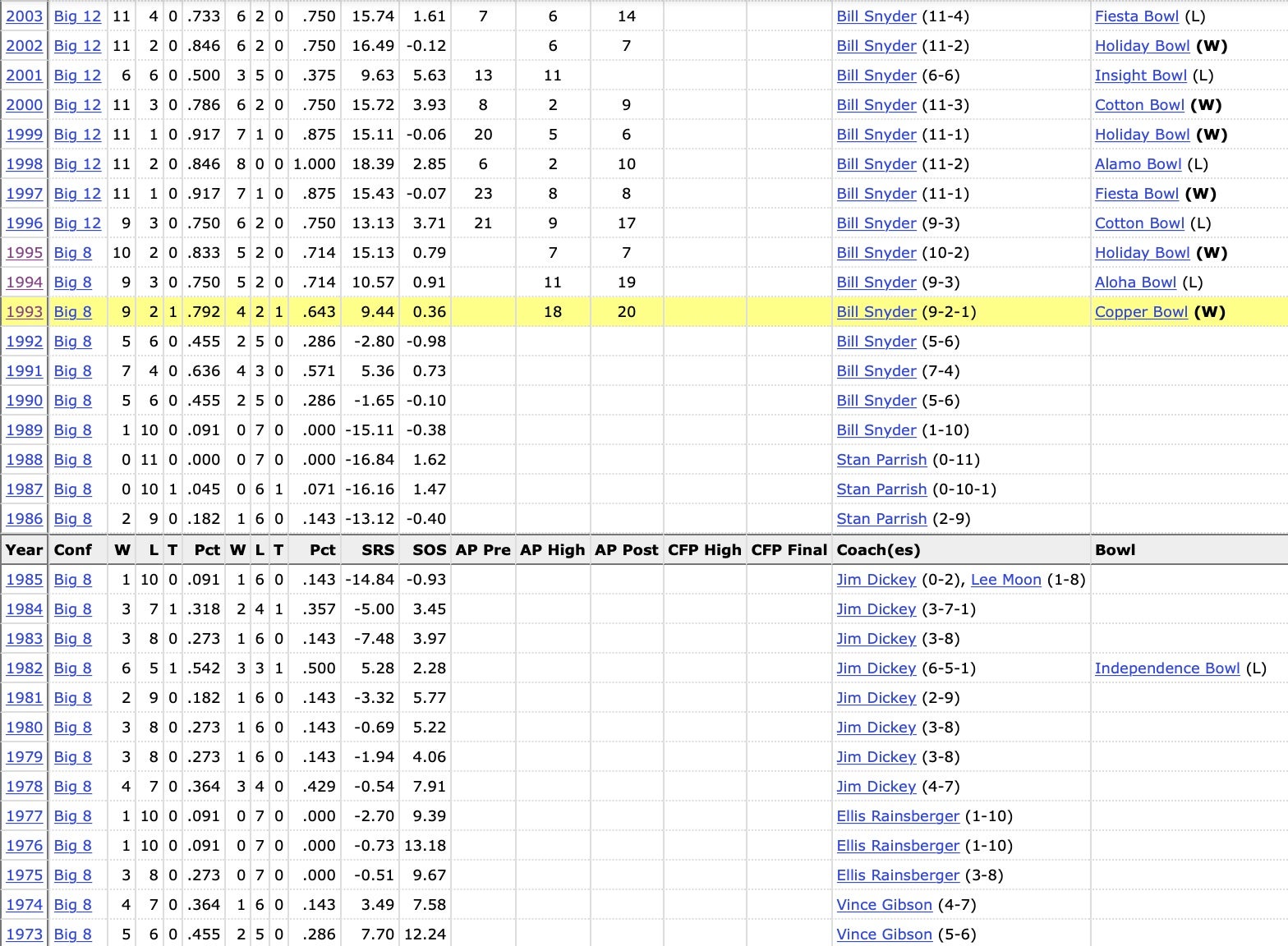 I'm too young to remember this, but there was a time when Kansas State was a horrific football program. A reliable bottom dweller in the Big 8 conference year-in and year-out. But in 1993, everything changed. For the first time since 1970, the Wildcats were a ranked football team again. And after SO MANY years of not even being a blip on the radar of college football, thanks to Head Coach Bill Snyder, by 1995 they were a Top 10 program (and proceeded to crack the Top 10 for eight out of the next nine seasons).