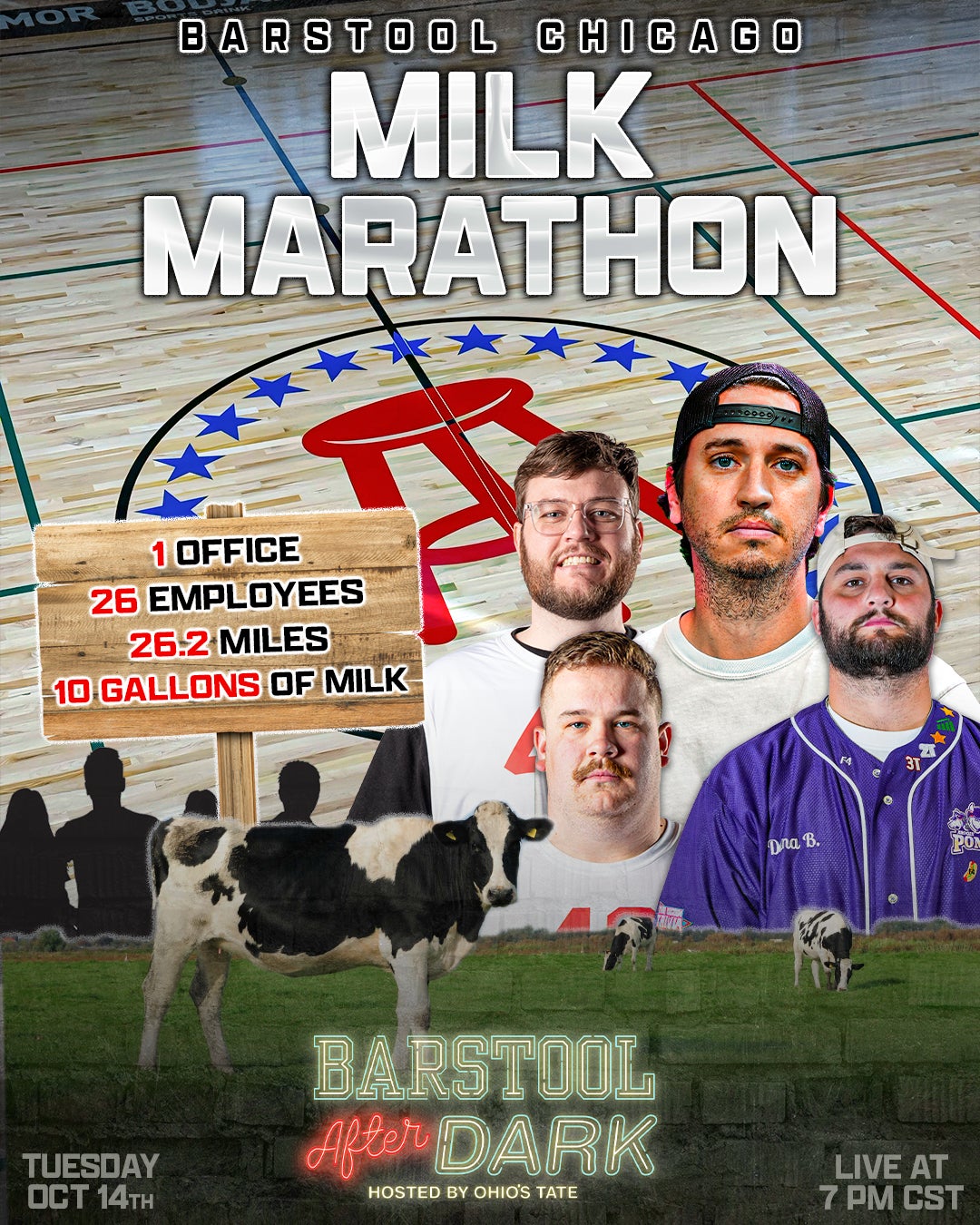 I don’t know how this is going to go. Could be a disaster. Could be beautiful. Could be a beautiful disaster. But we’ll find out tonight so tune in at 8 Eastern, 7 Central for Barstool After Dark: the Chicago Milk Marathon