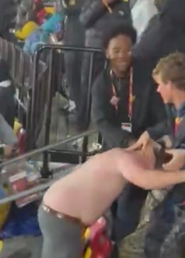 That usher has the biggest smile on his face looking at these two heavier set fellas going to battle. And let's not even mention Enter Sandman playing in the background and fans going absolutely batshit while this nothing-burger of a brawl occurs just mere feet away. Nothing like attempting to scrap with Metallica playing. Love the shirtless dude going back in for seconds and immediately getting put in a chokehold by security who said alright buddy, your fun is up.