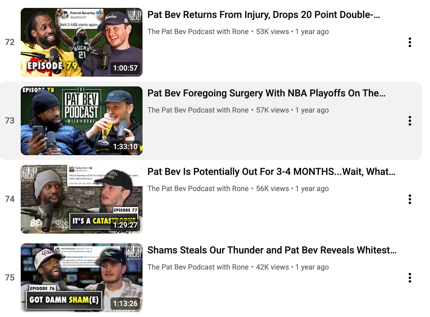 A little over a year ago, the Pat Bev Show was HUMMING. Good episodes would routinely rip over a hundred thousand views on YouTube—where, I'm told, this show is most frequently consumed. Looks like the average was probably in the 50,000 range, which is excellent. Truly a remarkable achievement, and worthy of the very swagger with which Pat would saunter through our halls on occasion to let us all know how utterly pathetic we were.