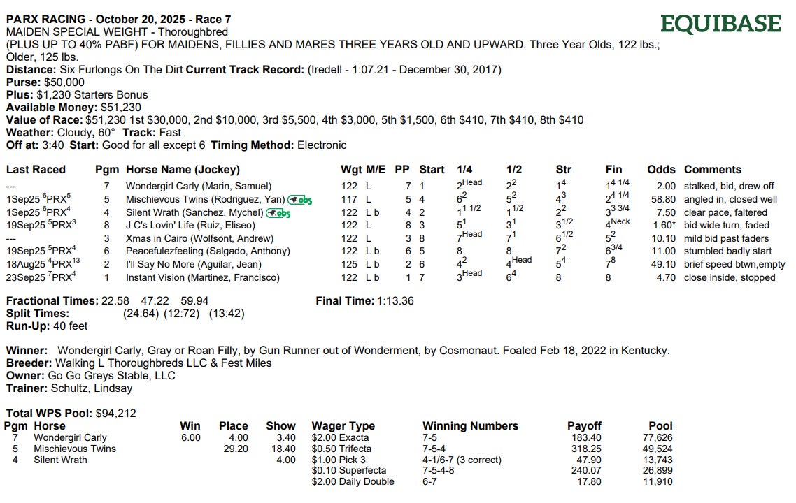 Sent off at odds of 2-1 in a field of 8, Wondergirl Carly made her racing debut a winning one in Race 7 at Parx Monday afternoon. Jockey Samuel Martin always looked confident. He was able to get Carly in a great position off an alert start. She sat off the leader into the far turn.