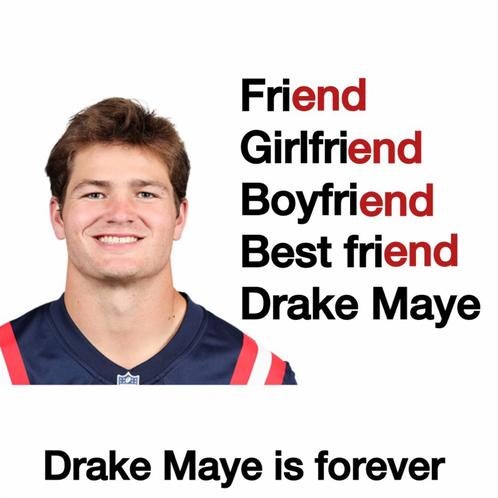 Who is Drake Maye? For the blind, he is light. For the hungry, he is bread. For the sick, he is the cure. For the lonely, he is company. For the sad, he is joy. For the prisoner, he is freedom. For the poor, he is treasure. For me, he is everything. If Drake Maye talks, I listen. If Drake Maye points, | look. if Drake Maye commands, I obey. If Drake Maye has a million fans, then I am one of them. If Drake Maye has ten fans, then I am one of them. If Drake Maye has only one fan then that is me. If Drake Maye has no fans, then that means I am no longer on Earth. If the world is against Drake Maye, then I am against the world.