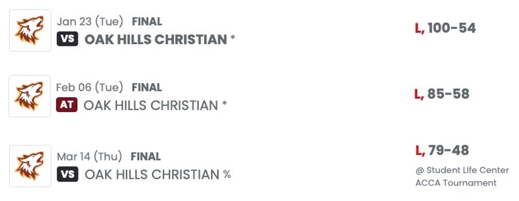Oak Hill Christian and Free Lutheran Bible College both play in the Northern Intercollegiate Athletic Conference. They squared off three times that year. The scores of the games were as follows.