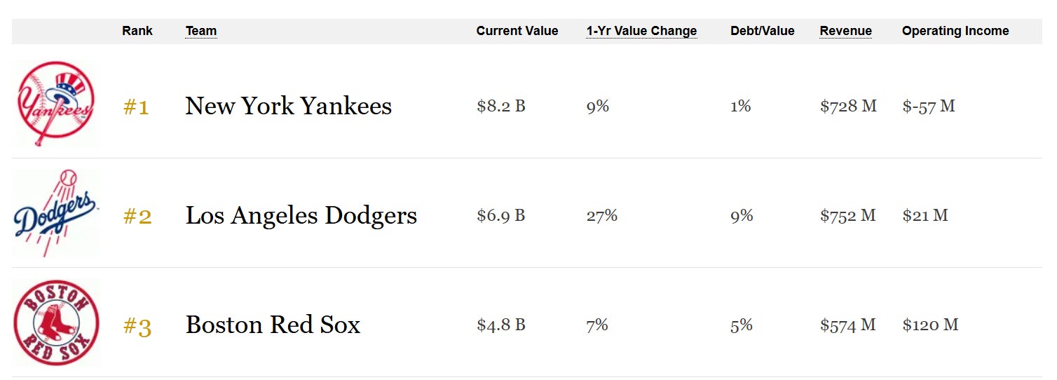 According to Forbes, the Red Sox are worth almost $5 Billion with a B dollars.
