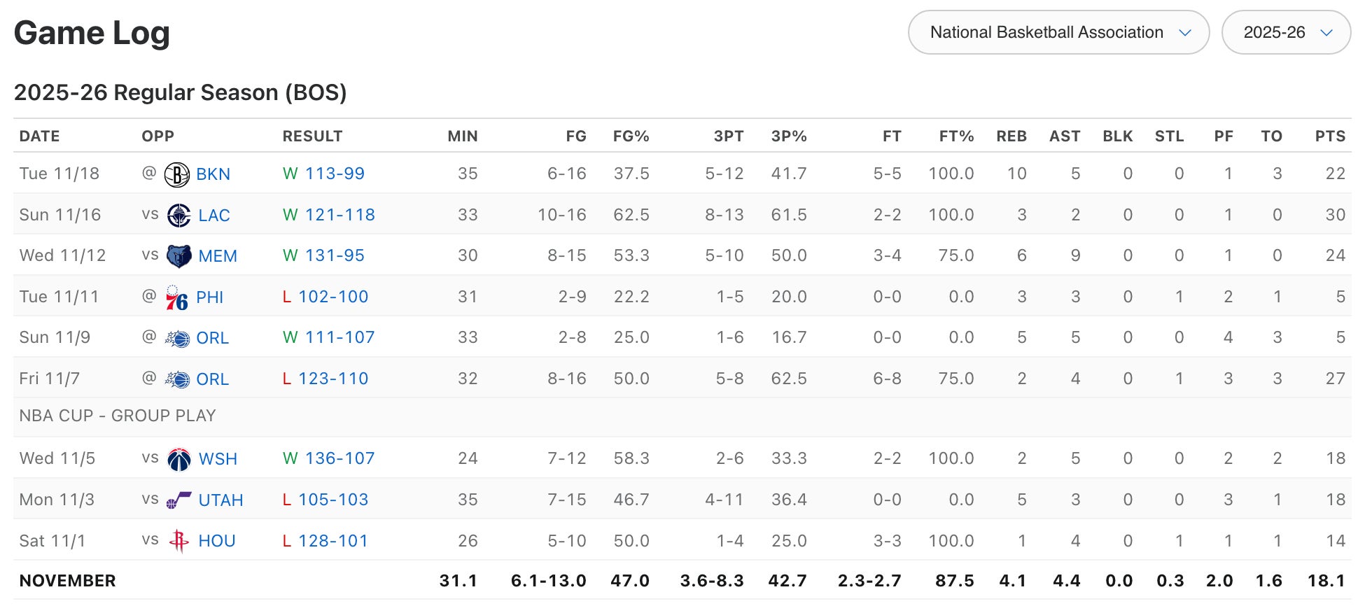 In the end, I'll take 29/4/4 on 9-19 (3-7) while being 8-10m from the FT line. The 8 TOs absolutely cannot happen again, but in just 32 minutes, I thought Jaylen filled his role to the level that was required. In the past, that slow start would have tanked his entire night, so it was good to see the mental toughness show up and prevent things from spiraling into what would have been a beyond terrible loss.