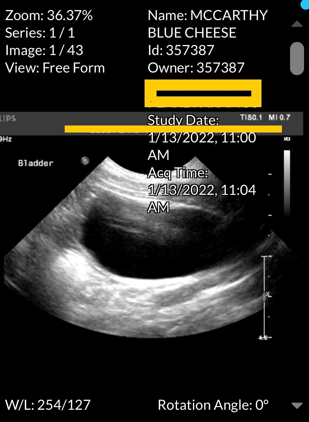 I breathed a sigh of relief because this blockage was much less dire than any kidney damage, and during my euphoria, the doctor informed me that in order to remove the blockage, Blue Cheese would have to spend the next 24 hours under their care.