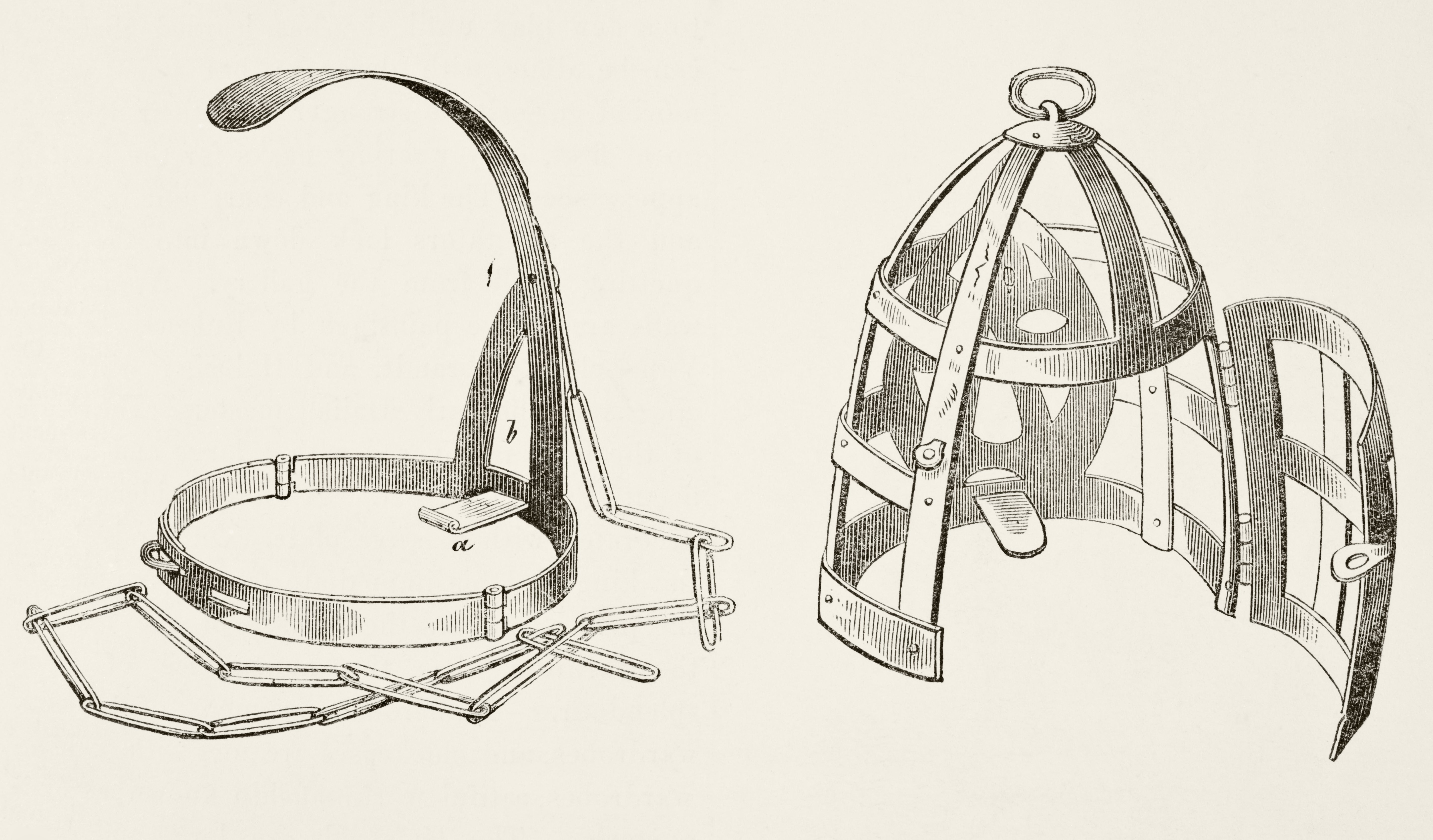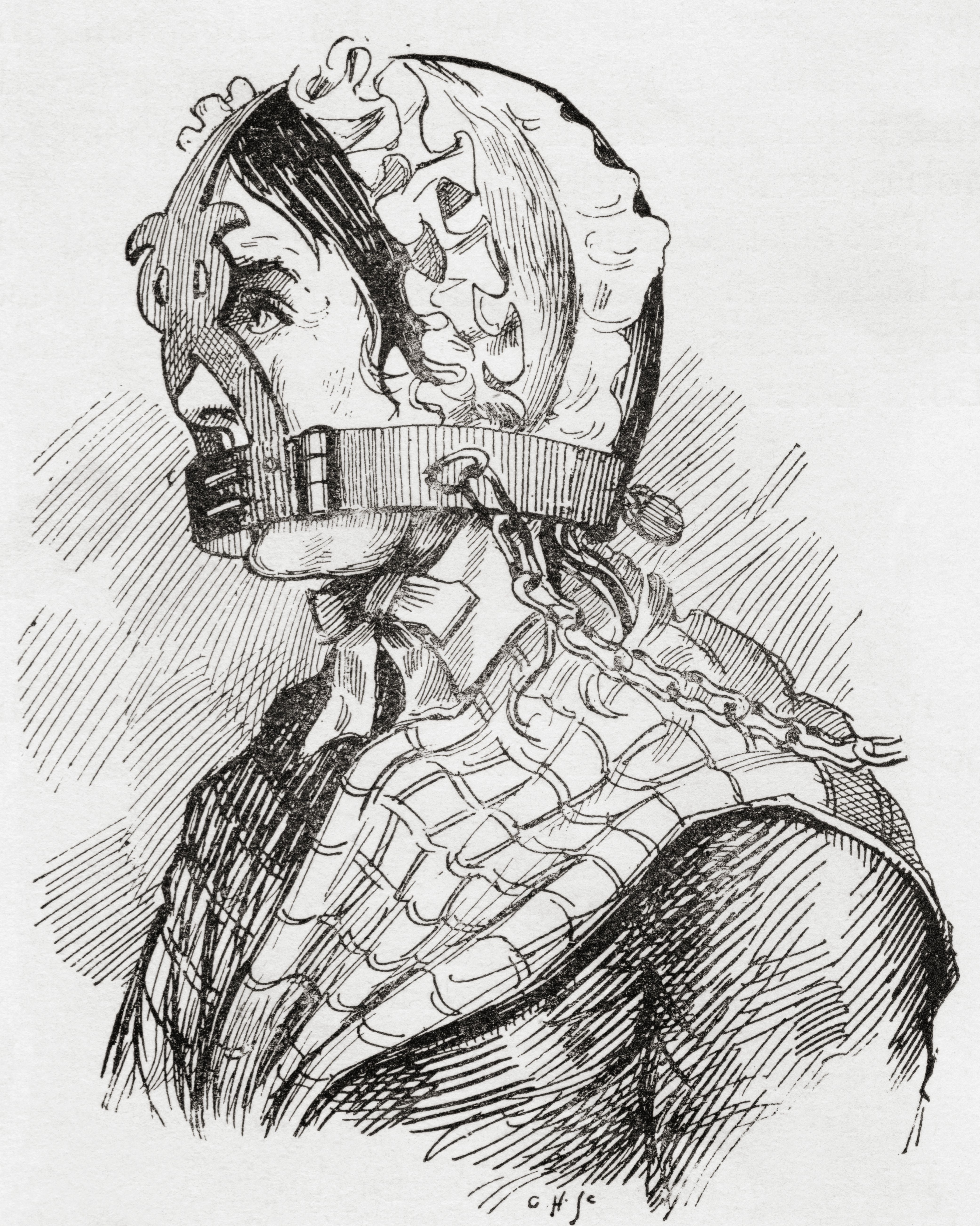 A Scold's Bridle (sometimes called a witch's bridle or a gossip's bridle) is an iron muzzle inside an iron framework that encloses the head. An attached bridle-bit was slid into the mouth and pressed down on top of the tongue as a compress. It functioned to silence the wearer from speaking entirely and caused both pain and physiological trauma to scare and intimidate the wearer into submission.
