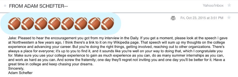 On today's Pardon My Take... ADAM SCHEFTER! The ESPN NFL Insider joined Mr. Cat and Mr. Commenter on today's show to discuss the biggest stories in football this season, the future of his career, and much more. The guys also covered a topic that included myself. When I was a sophomore in college, I realized that Adam Schefter and I had something more in common than being Big J's. That's when I sent him an email, unsure on whether or not I'd get a response: