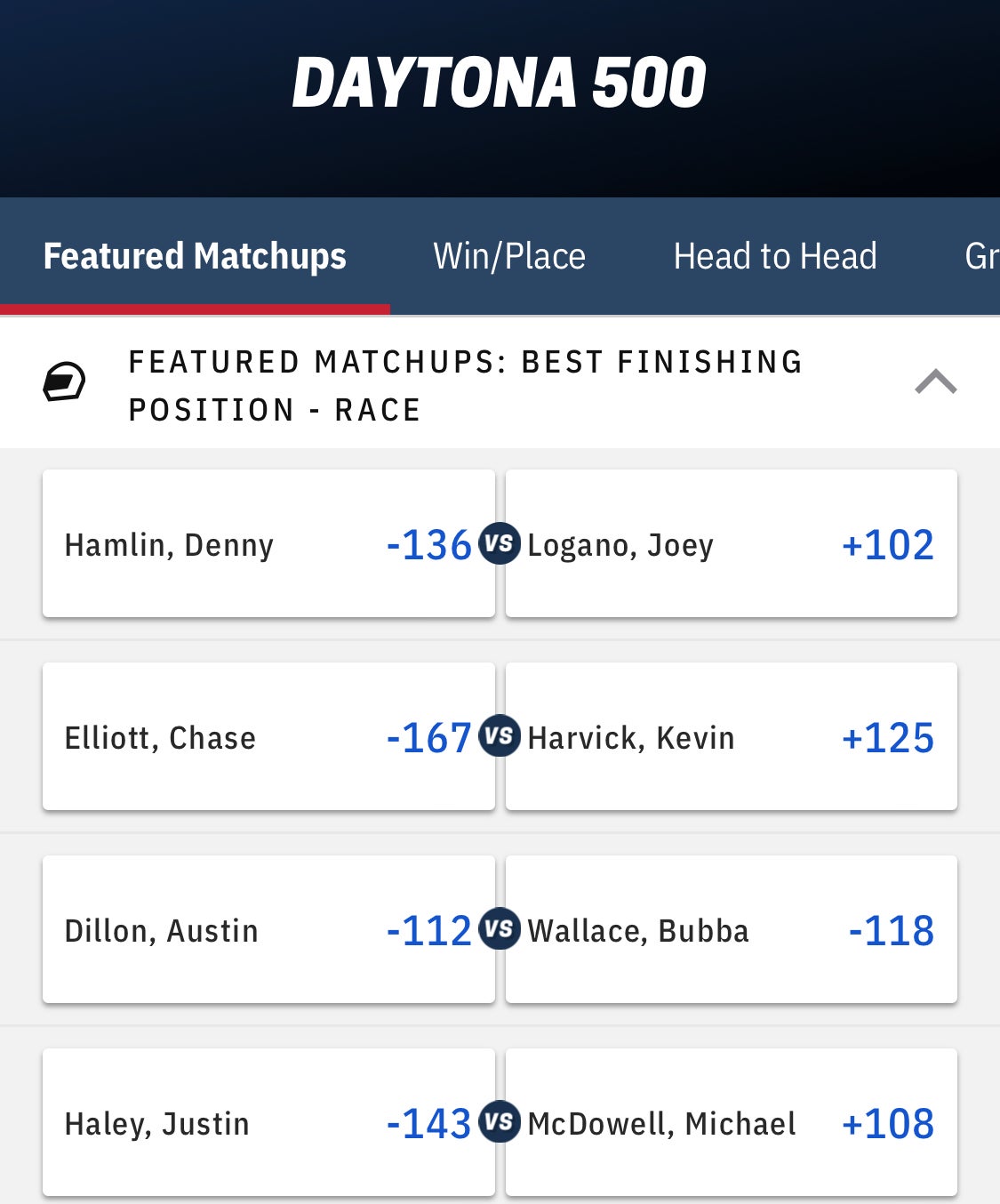 The Barstool Sportsbook has a full menu of bets for the race and asked for our input on a couple they want to highlight, so after much deliberation, this week's Featured Matchup is Denny Hamlin (Carl's guy) vs Joey Logano (Frank the Tank's guy).