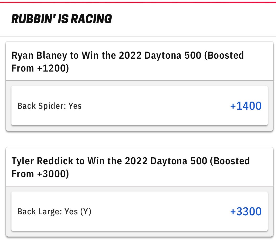 On top of that head-to-head, the Sportsbook is also boosting odds on both mine and Spider's favorite to win… Spider is going with a more chalk pick in Ryan Blaney while I am picking a longer shot in Tyler Reddick, who was leading through 52 laps in LA before the axel snapped on his 3Chi sponsored Chevy Camaro.