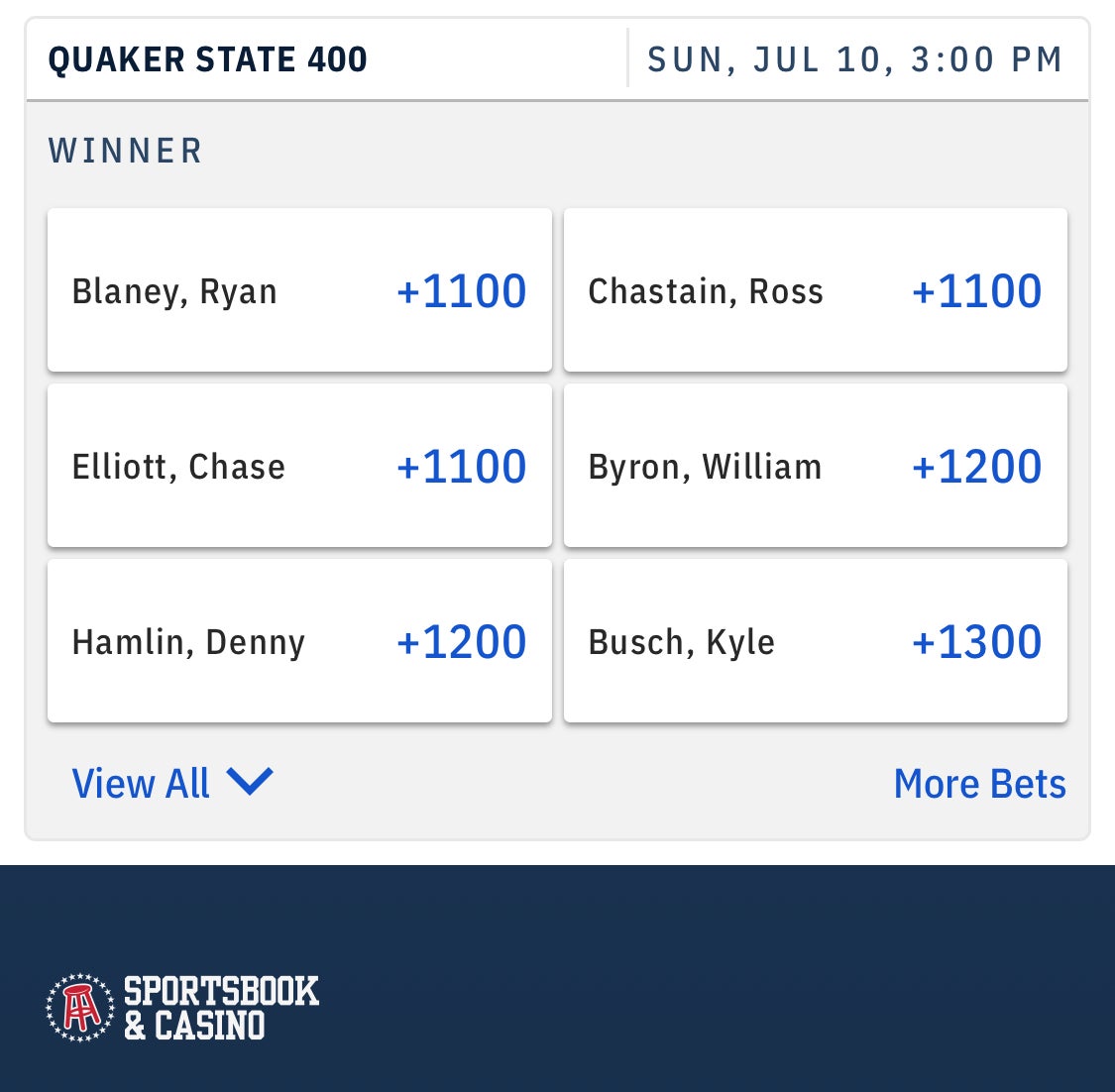 It's the second time the Cup Series is being run there this year… The first time around, there were 46 lead changes from 20 different drivers, so there is no overwhelming favorite on the Barstool Sportsbook and no driver with shorter odds than +1100 (Blaney, Chastain, and Elliot all at +1100).
