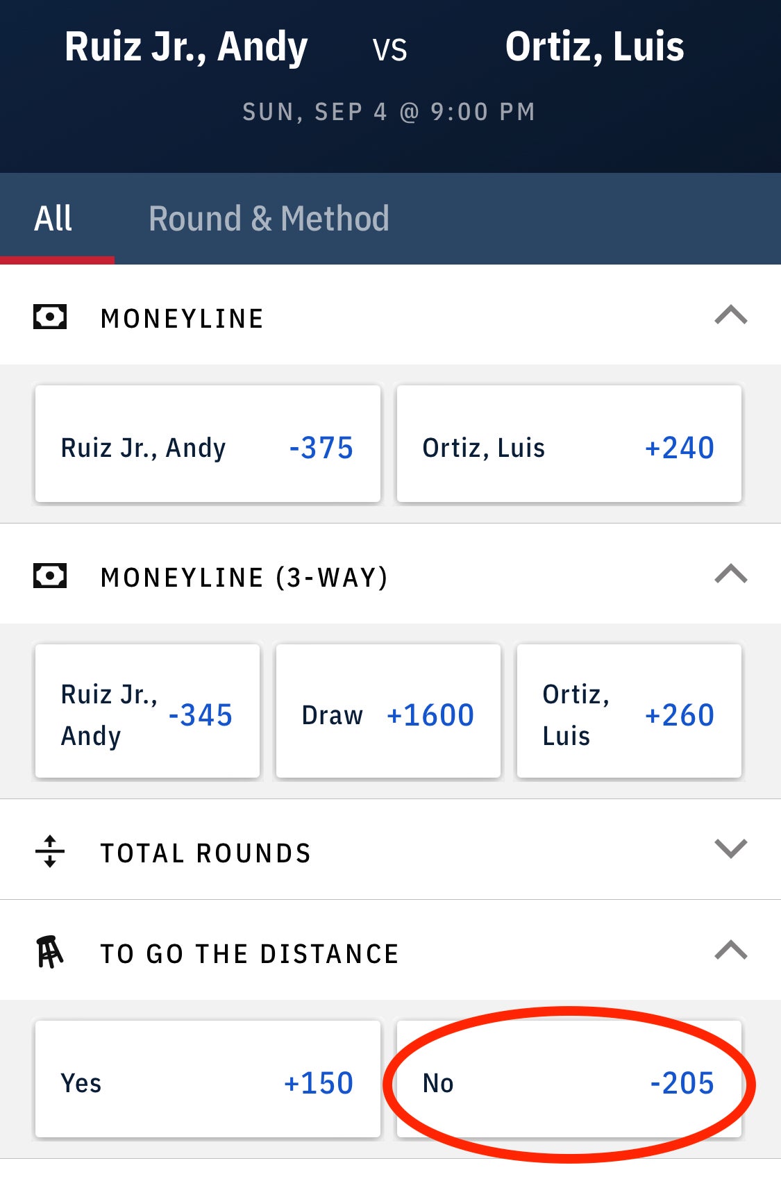 HOWEVER… Ortiz throws BOMBS, so I am tempted to pay $205 on the BarstoolSportsbook for a stoppage without picking a side.